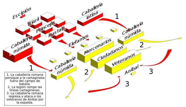 Escipión había pensado una estrategia para contrarrestar la potencia de los elefantes de Aníbal, haciendo que sus tropas formaran pasillos para desconcertar a los torpes paquidermos, además de hacer sonar espadas y escudos además de deslumbrar a los animales con el reflejo del sol.